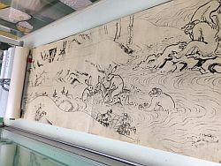 この鳥獣人物戯画のレプリカは、それを勉強するうえでの重要な資料となっております。12~13世紀にかけて、僧侶たちによって描かれた、当時の世相を諷刺した巻物とされています。4巻からなるうちの甲巻の擬人化された動物たちの動きやキャラクターが、現在のマンガやアニメーションに見られる手法に似ていることで有名です。