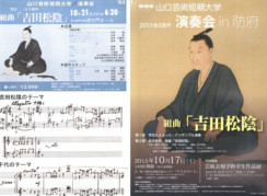 また、来年は明治維新150周年および山口芸術短期大学50周年となることから、定期演奏会のテーマとして取り上げた吉田松陰の半生を音楽で描いた組曲「吉田松陰」の楽譜やポスター等、本短期大学の卒業である芸術家吉村芳生の作品の展示など、芸術とともに歩んできた本短期大学の歴史を振り返ります。